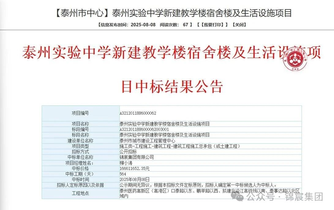 从泰州市公共资源交易中心获悉,锦宸集团中标泰州实验中学新建教学楼宿舍楼及生活设施项目,这是继张甸镇村民集中居住区建设项目一期工程(北沿江配套)、蒋垛镇果蔬深加工厂房建设项目(二期)后,集团公司在一个月内的第三次中标,中标总额达2.56亿元,为冲刺全年再发力打下坚实基础。