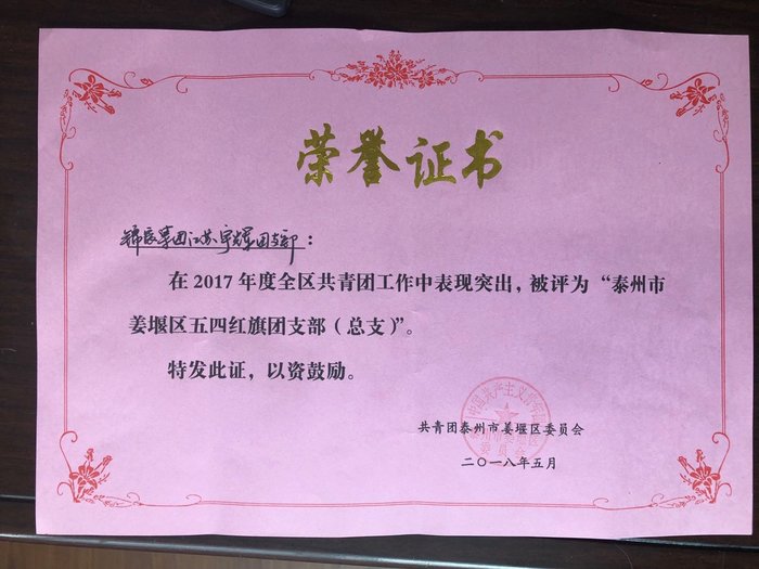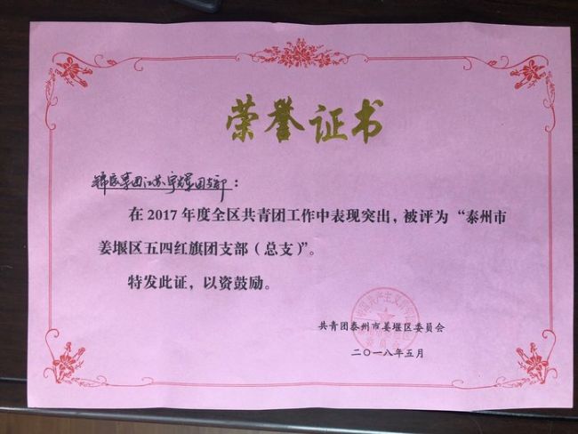 2017年以来,江苏宇辉团委在锦宸集团江苏宇辉党支部的正确领导下,深入学习党的十九大精神和习近平新时代中国特色社会主义思想,按照党支部和上级团组织工作部署和要求,以思想建设为先导,以组织建设为基础,以文化培育为载体,以品德修养为目标,在加强团的自身建设、拓展团的工作领域、创新团的工作机制等方面取得了新成效。荣获“2017年度泰州市姜堰区五四红旗团支部”殊荣。