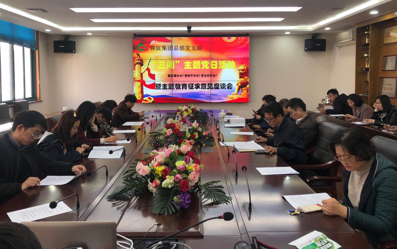 11月21日下午,锦宸集团总部支部开展“三问”主题党日活动暨“不忘初心、牢记使命”主题教育征求意见座谈会,集团公司总部支部党员、总部职工参会。