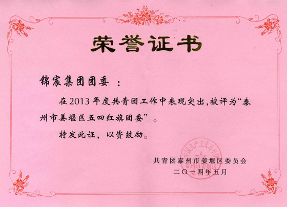 近日,集团公司团委荣获2013年度姜堰区“五四红旗团委”称号。据悉,全区共有直属团委50多个,非直属团委若干,此次评选仅有6个基层团委获此殊荣。“五四红旗团委”是基层团组织的先进典型,同时也是团区委授予基层团组织的最高荣誉,这是对我公司共青团工作的肯定,更是对我公司共青团工作的极大鼓励。
