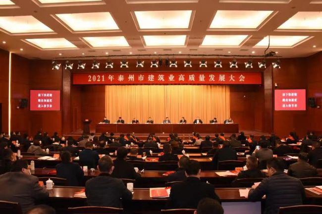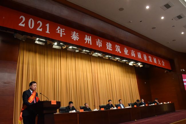 2021年3月3日,泰州市召开建筑业高质量发展大会,回顾总结全市2020年建筑业工作情况,研究布署2021年建筑业工作目标任务,推动全市建筑业高质量发展。市委副书记、市长朱立凡等政府主要领导;省住建厅总工程师施嘉泓;市人大市政协相关领导;市政府秘书长、分管副秘书长;各市区主要负责人;住建及其他相关部门和单位等出席;集团公司董事长李焕军受邀参加了此次会议,并在大会上做表态发言。