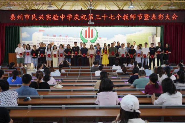 大会在庄严的国歌声中拉开序幕。民兴中学校长曹福春代表学校向全体教职工致以节日问候和美好祝愿,向受到表彰的集体和个人表示热烈祝贺。并紧扣当前教育生态的改变、民办学校发展的变革,分析形势、研判趋势。他表示,只要全体师生勤奋敬业、不辱使命,凝心聚力、和衷共济,制度第一、强调执行,追求细节、做好小事,成就教师、发展学生,就一定能战胜一切困难,赢得民兴中学教育事业的新发展。副校长葛士才宣读了2020-2021学年度教育教学教科研各先进集体和先进个人表彰奖项名单。在热烈的《欢迎进行曲》中,主席台就座的领导为获得表彰的集体和个人颁发了荣誉证书,并分批合影留念。