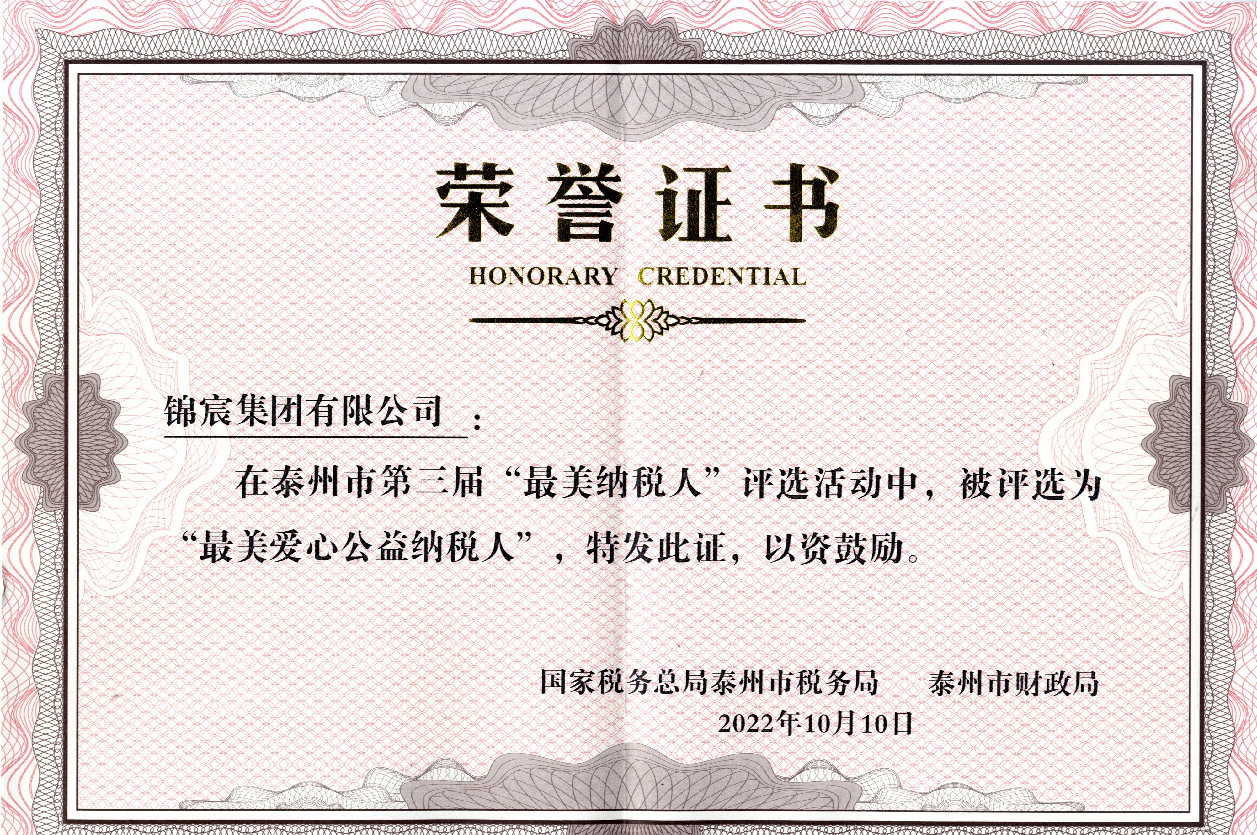经推荐申报、审核初选、公众投票、专家评审和媒体公示等严格程序,此次活动共评选出30名“最美纳税人”,分别授予“最美来泰投资纳税人”“最美爱心公益纳税人”“最美创业富民纳税人”“最美专精特新纳税人”“最美税收贡献纳税人”称号。锦宸集团荣获“最美爱心公益纳税人”称号。